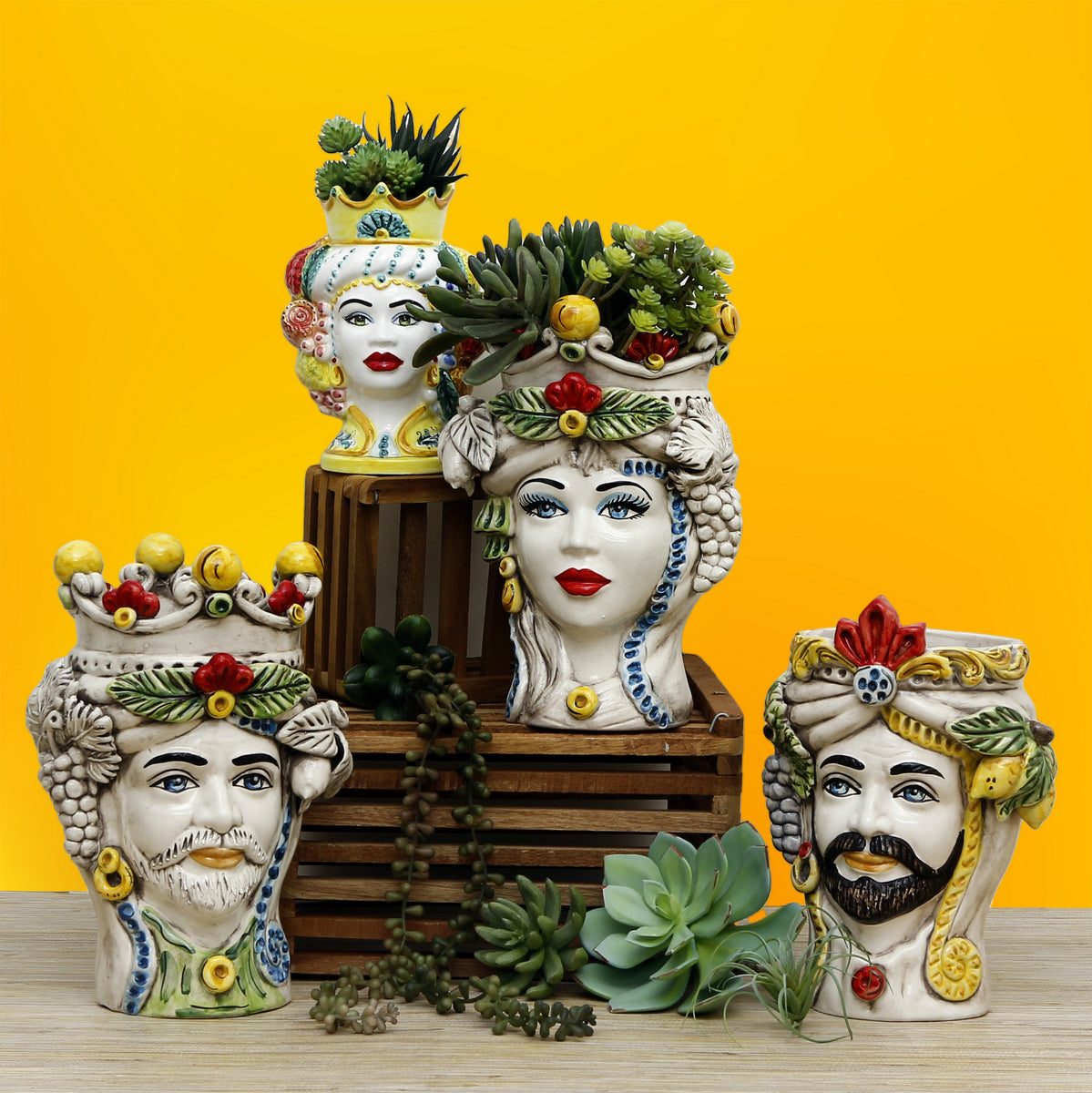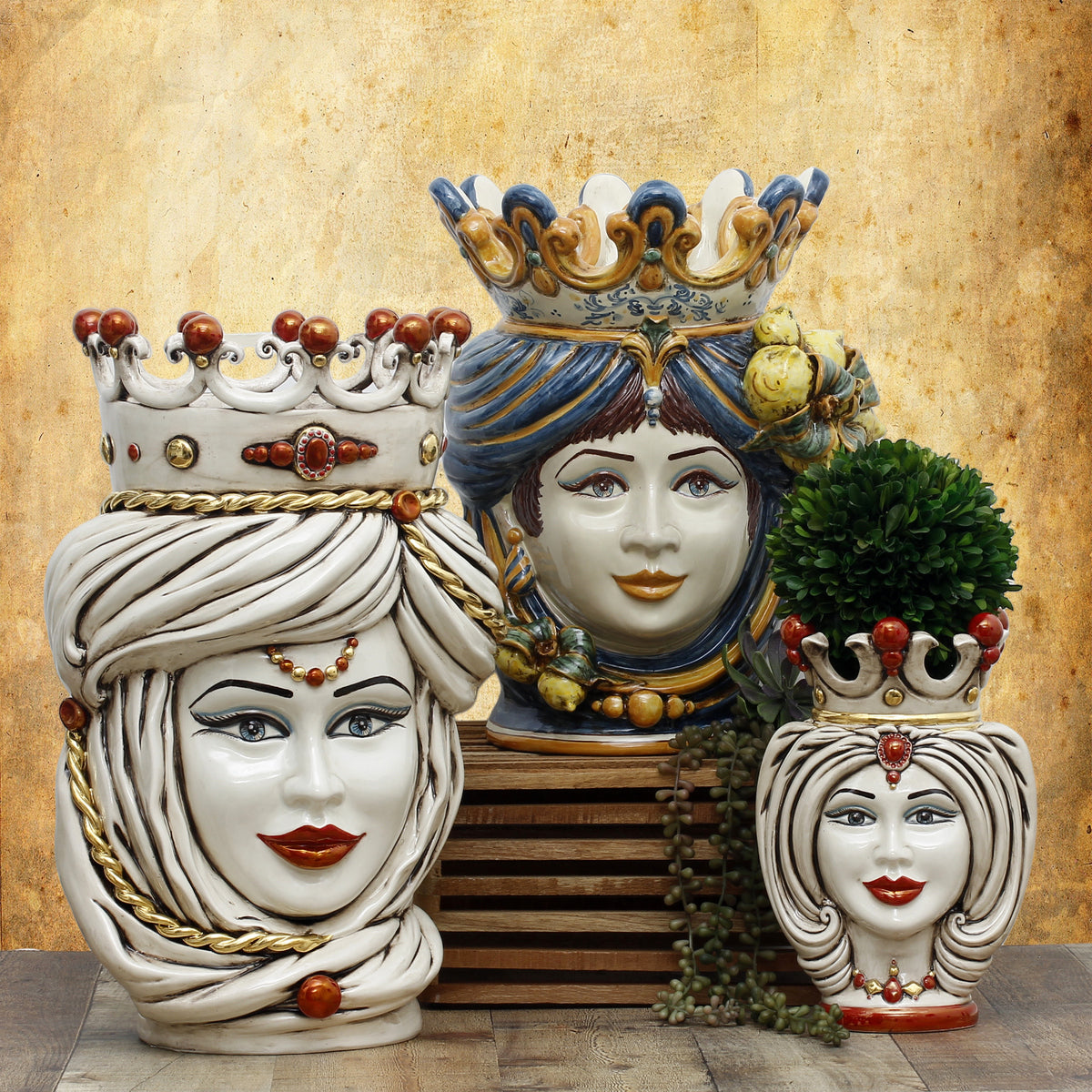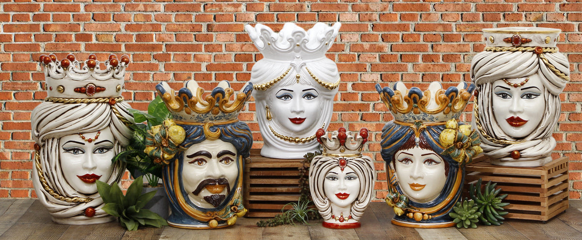 Our Caltagirone collection showcases the classic Sicilian Heads Vases, also referred to as "Teste di Moro" (Moorish Heads), that are ornamental planters adorned with regional fruits like lemons and pomegranates, as well as Baroque bass relief designs.