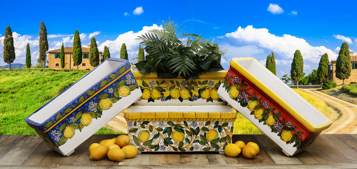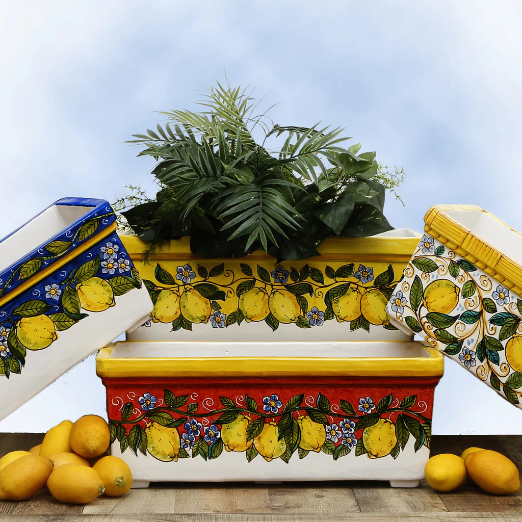 Our exclusive and hard to find rectangular jardinieres are made of double-tick strong clay, double fired and of course, fully hand painted by master artistes from the renowned Sicilian town of Caltagirone.