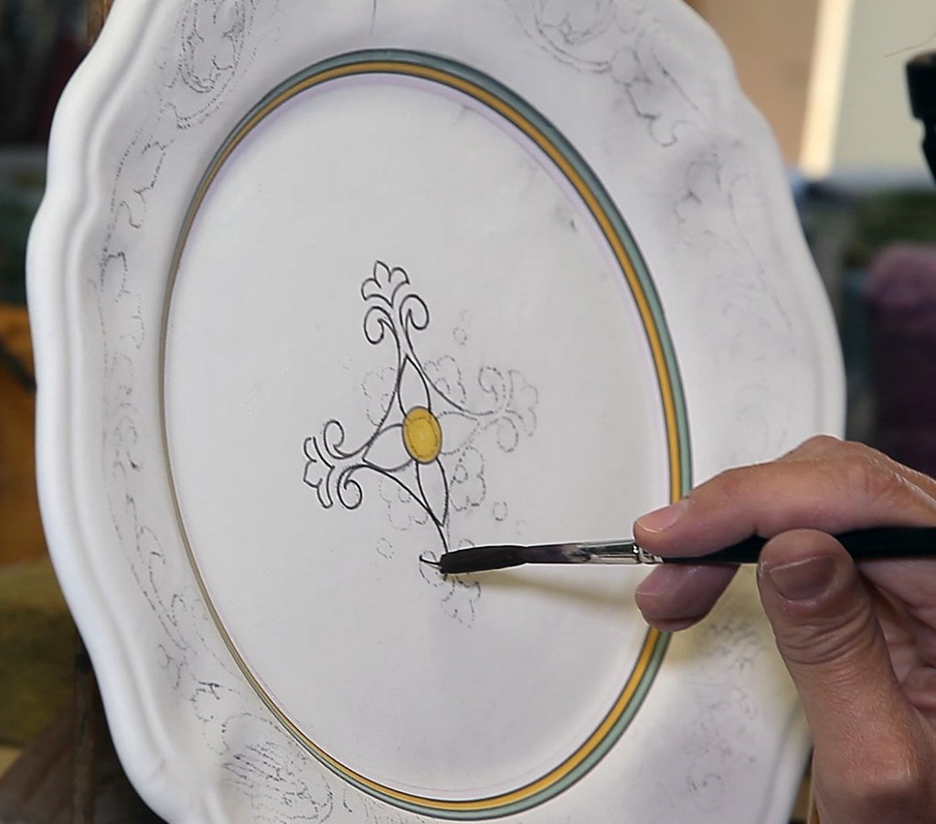 The Painter, "Il Pittore", may paint a decoration freehand, or use a type of pounce, "Spolvero", to stencil sketches of the design taken from historical drawings.