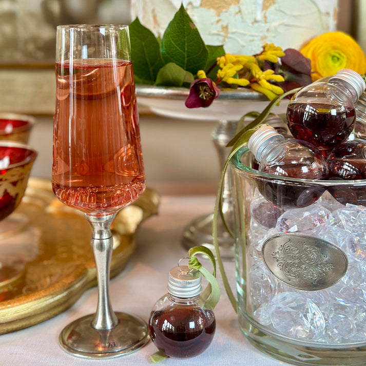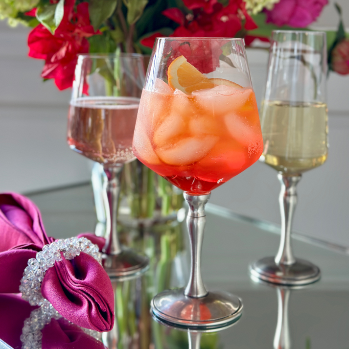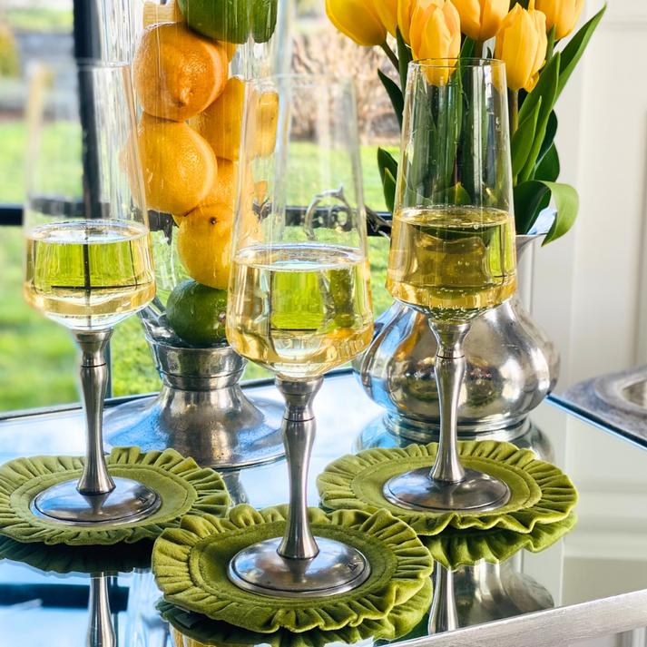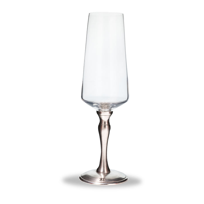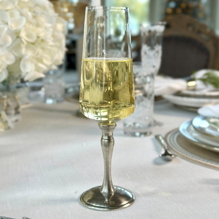 Graceful forms of glittering glass are combined with handcrafted pewter stems. This timeless glass adds an elegant feel to any table. Italian pewter and glass, Hand made in Italy. Hand wash only, do not soak, wash with lukewarm water, and dry immediately.