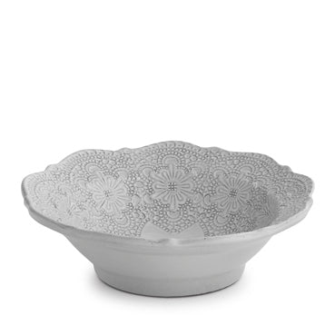 The Merletto Collection, meaning lace, is crafted using a delicate glaze over rich, black clay. The pattern is inspired by handmade, antique Italian lace that is hand-pressed into the ceramic prior to the application of the glaze. The beautiful, vintage design, elegant colors and intricate details all combine to create a unique and charming table setting. Handmade in Italy - Dishwasher safe. Size: 7.25" D