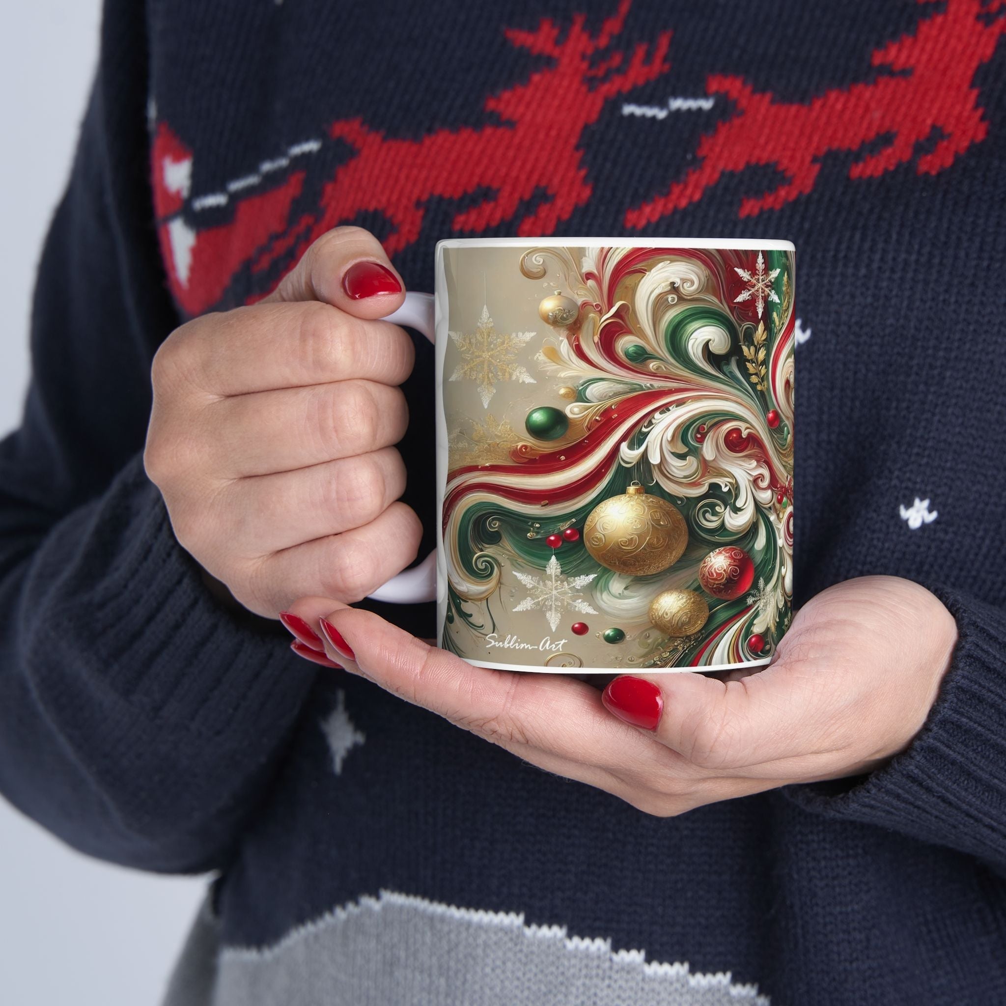 Bring the magic of Christmas into your home with this beautiful RC Design mug. Crafted using sublimation techniques, it boasts a unique and artistic design that features an innovative "Fluid Wave" pattern, complemented by subtle Christmas elements, including ornaments and traditional winter images.