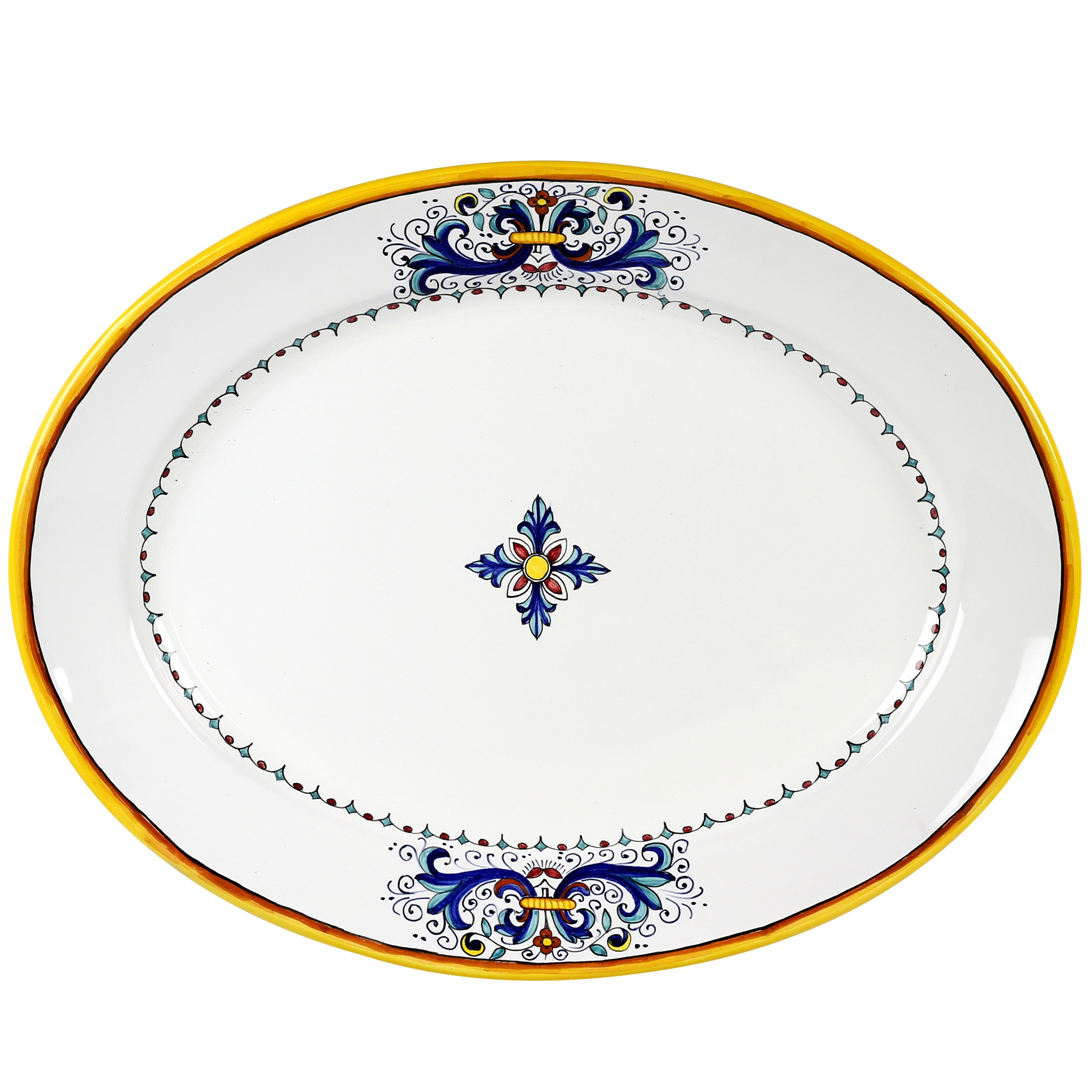 The Ricco Deruta is Deruta's most renowned design featuring colors such as royal blue, yellow gold, and emerald green, all traditional renaissance era colors that bring royal elegance to your table.